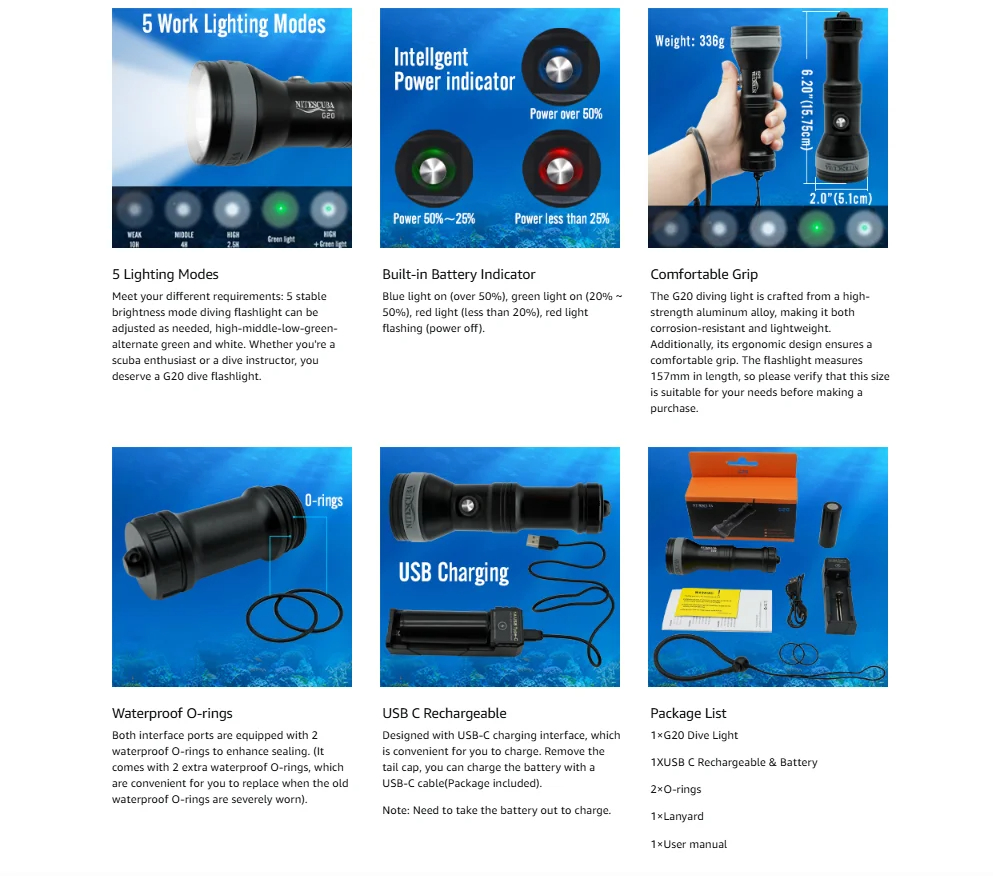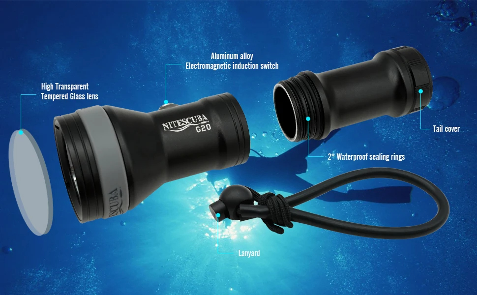 1xG20 dive light, 26650 recharge battery,Charger,Lanyard,extra O-ring.