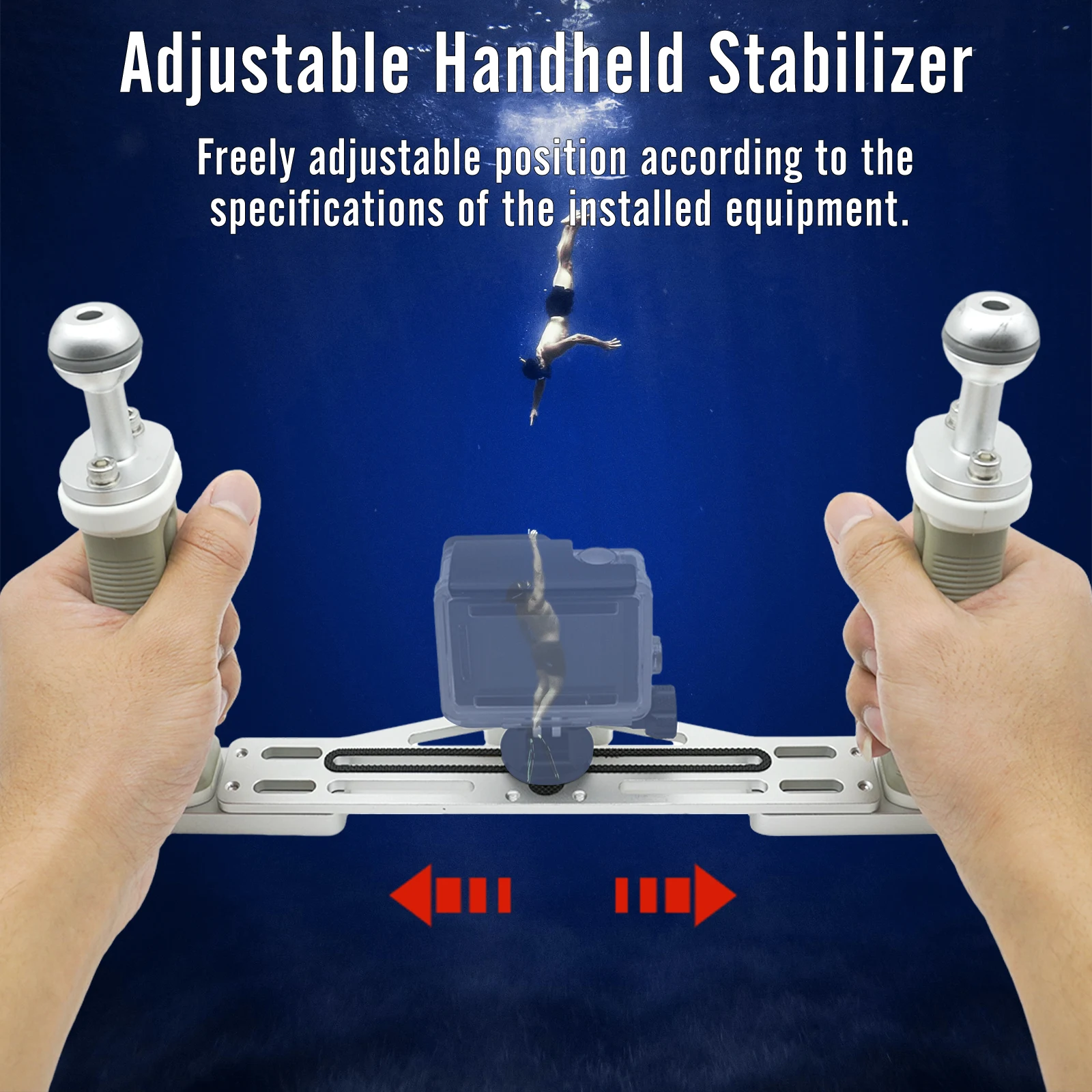 This handheld stabilizer is made of aviation aluminum, which is lightweight, corrosion-resistant. Its dual grip design makes it convenient for underwater photography. The tray has an extendable range of 11.5 - 13.5 inches and can be adjusted by sliding the handle. It is compatible with various waterproof devices, including Divevolk phone cases, GoPro 11/10/9/8, Olympus TG-5/6, etc.