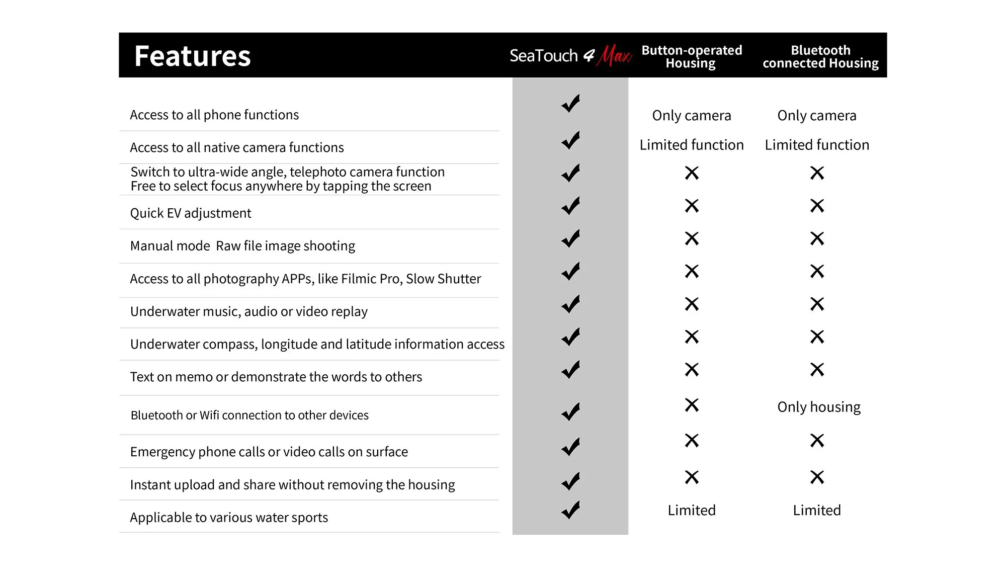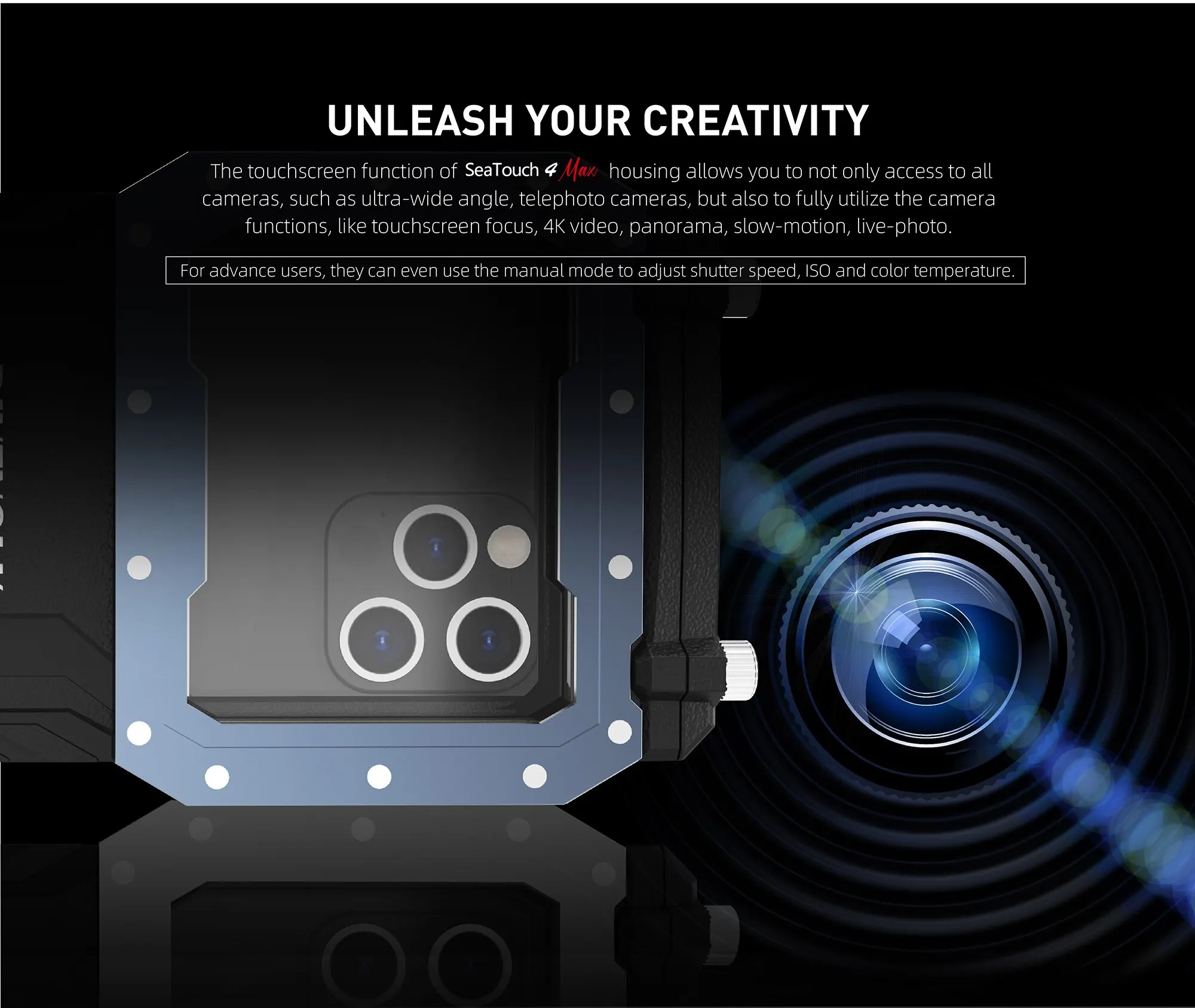 • Complete Camera Control: the only dive housing to utilize all of your phone’s camera features without any limitations.