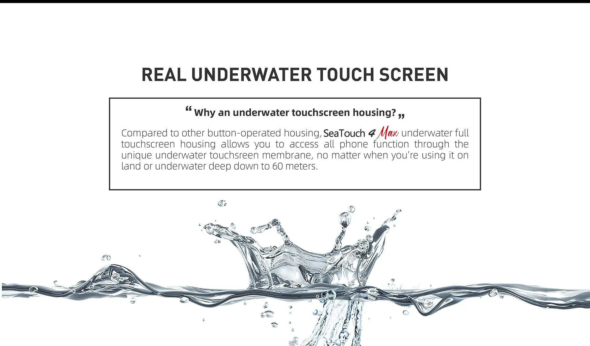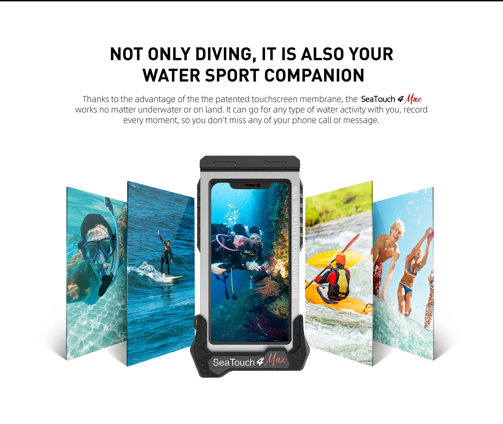 A revolutionary underwater smartphone housing that redefines accessibility and functionality beneath the waves. Unlike traditional button-type housings, the SeaTouch 4 Max Plus allows unrestricted access to all of your phone's functions via touchscreen, even at depths of up to 60 meters. Whether you are at the surface or deep underwater, you can seamlessly use all apps, ensuring that your smartphone's full potential is always at your fingertips.