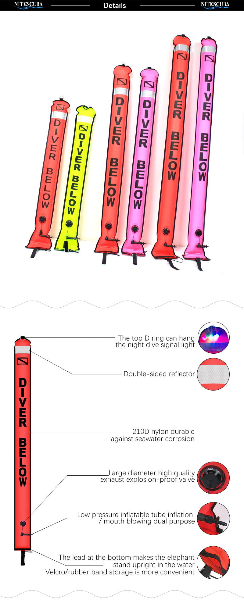 diving SMB buoy Made of high-quality materials, with good sealing performance, explosion-proof, durable,brightly colored design, which easily attracts people's attention and allows them to quickly find your location,It provides additional safety during diving and is an essential accessory for marking diving positions.