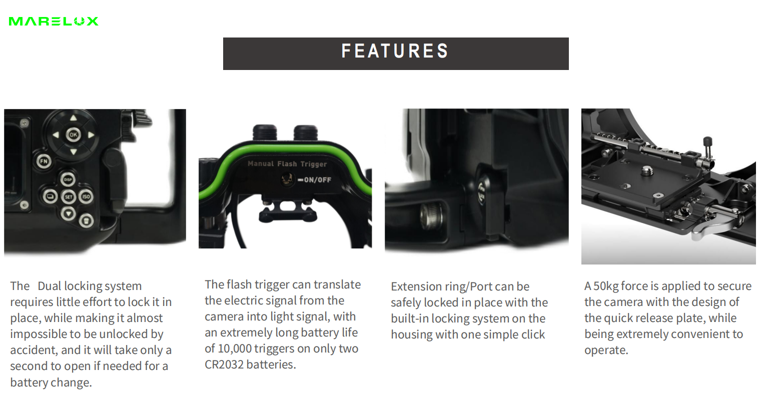The double-lock system ensures safe operation. The CR2032 battery flash trigger supports up to 10,000 trigger activations. The extension ring can be locked with one click. The quick-release board is designed with a 50kg load-bearing capacity for convenient operation.