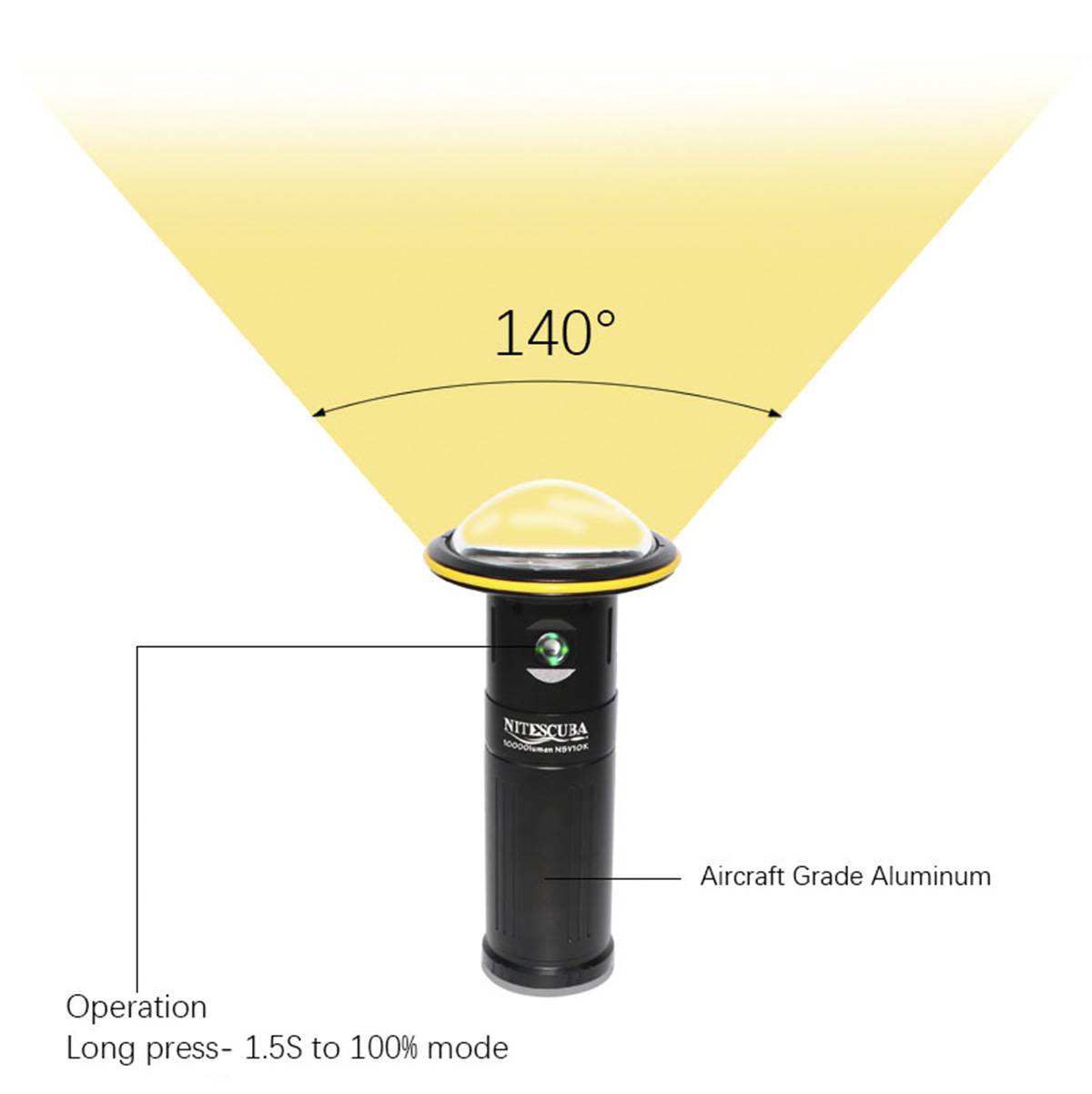 The V10K has a max output of 10000lumen, a 68 minutes burn time. The whole body is a full aluminum with hard anodizing. In the front is a Glass dome with a 140-degree beam angle underwater. The V10K is Very easy operating.
