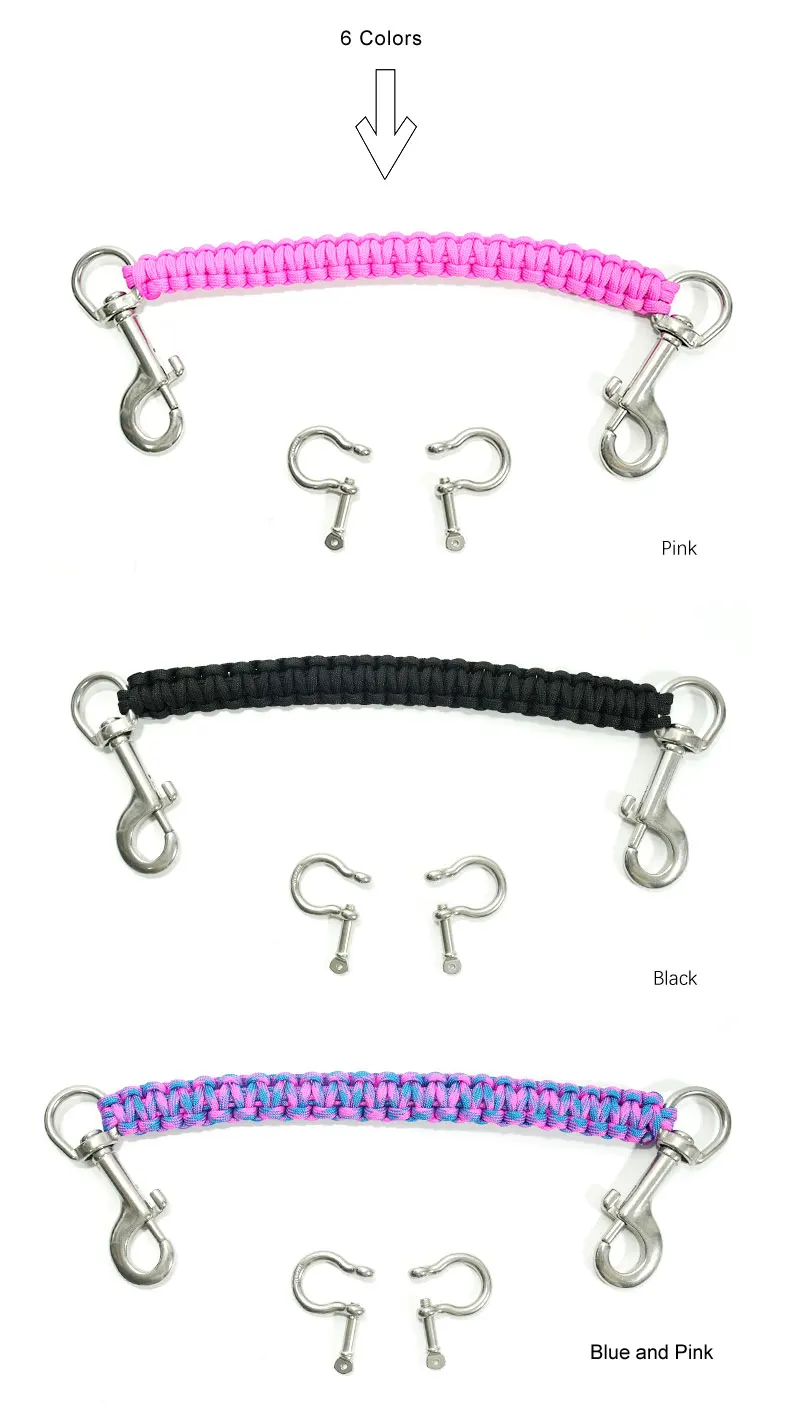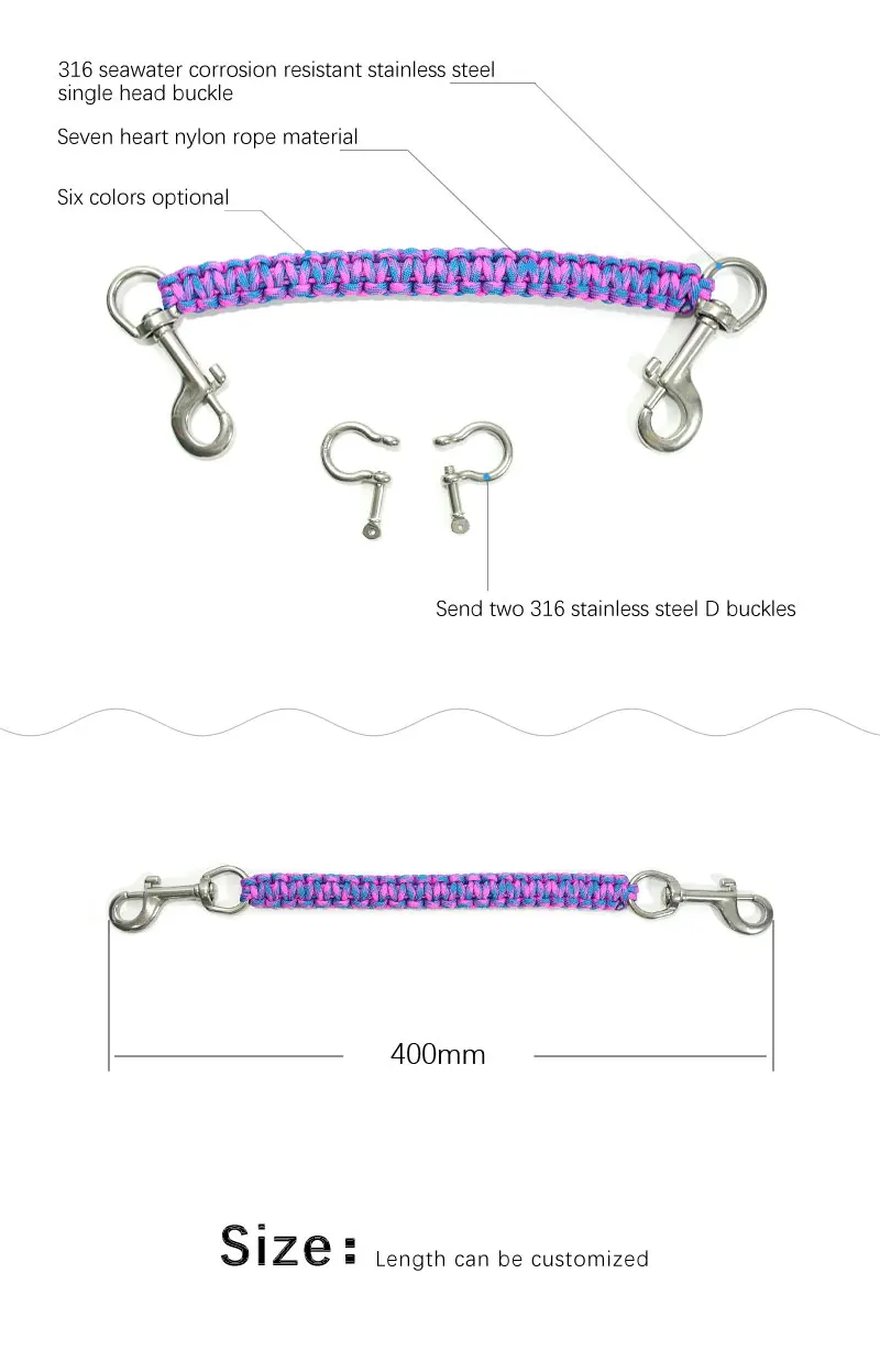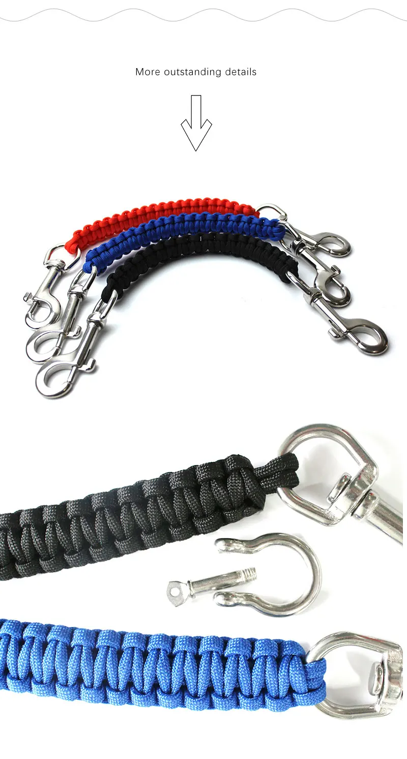 1:Parachute Rope Material -- Military grade type III 7 strand 300 lb test cord.316 stainless steel Swivel hooks