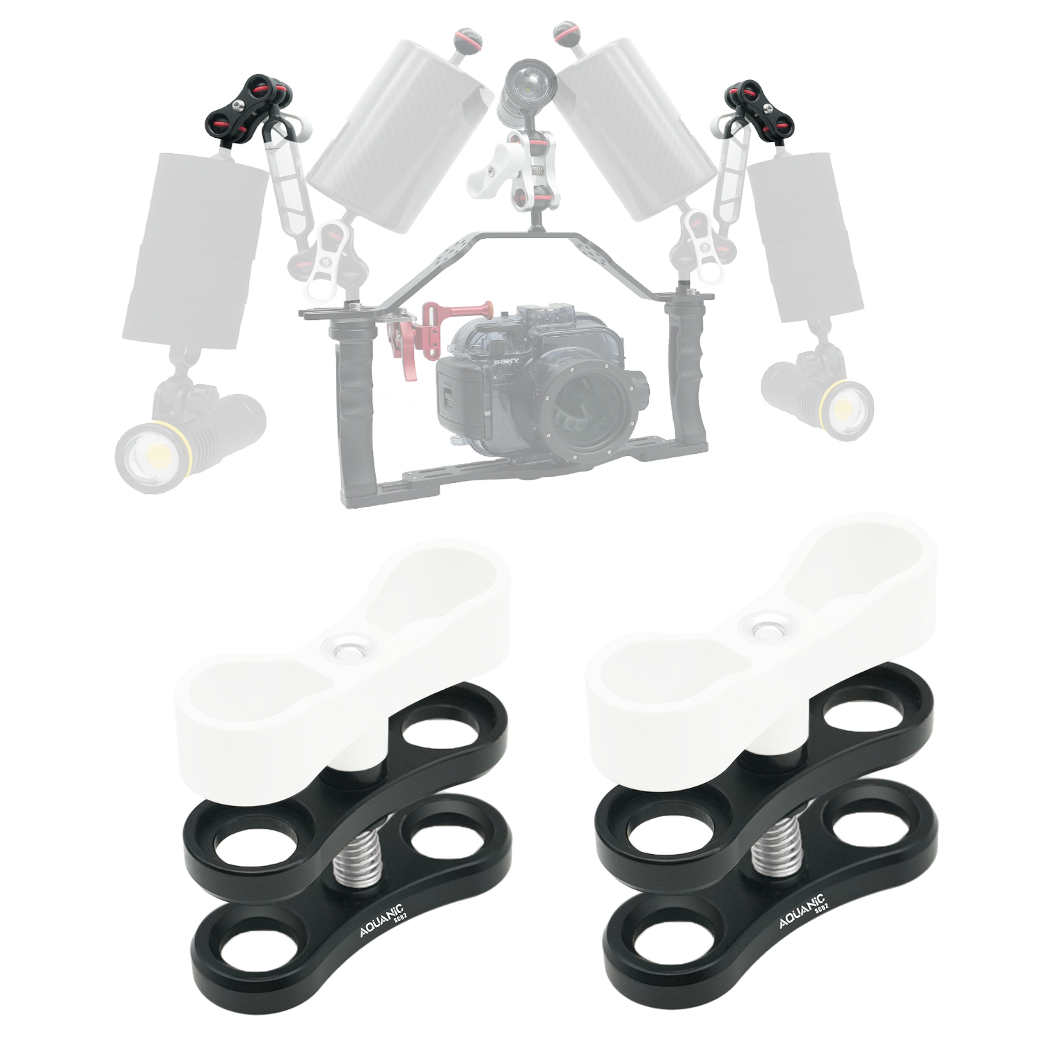 Aluminum alloy 2-hole fixture, a must-have accessory for underwater photography, with a butterfly-hook type fixation device. Suitable for underwater photography and use with stroboscopic lights. Compatible with multiple camera brands, including GoPro and Sony.