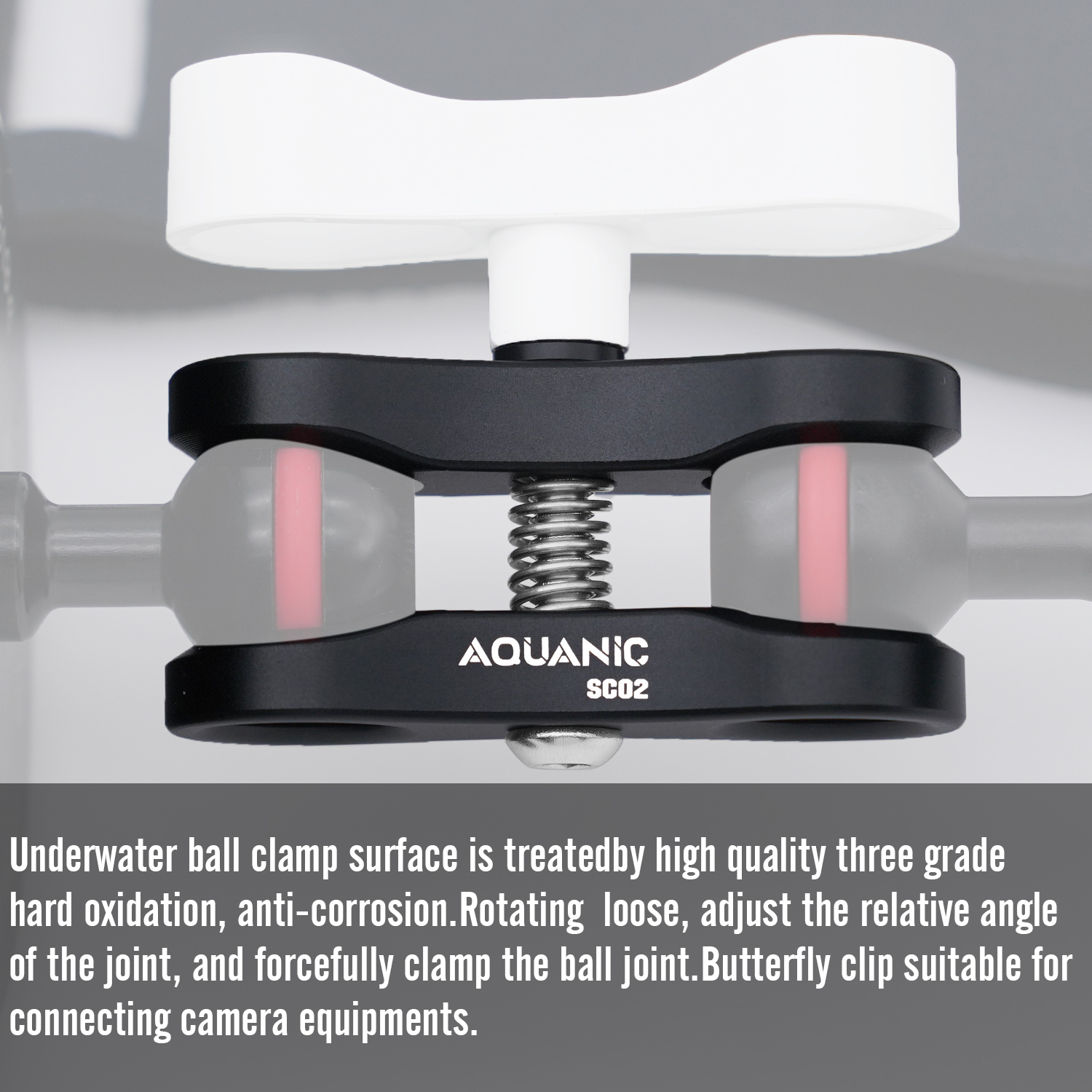 ①Aluminum Material:The ball joint clamp is make of Aluminum material and 316 stainless steel screw&spring,Makes it more durable and robust when use under sea water,No rust after scuba use.