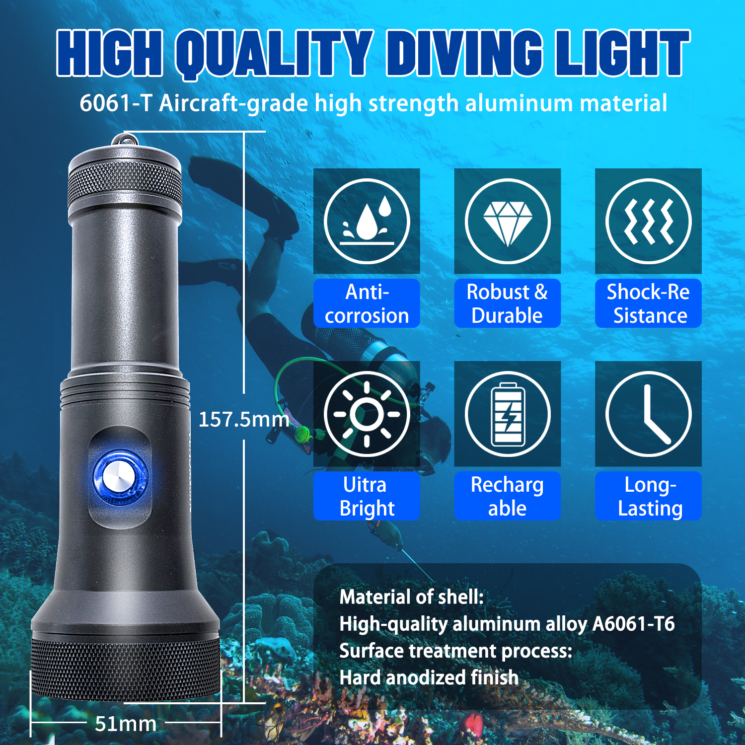 Nitescuba S20 Diving Flashlight Aluminum 2000 lumens and 8 degree narrow beam-nitescuba