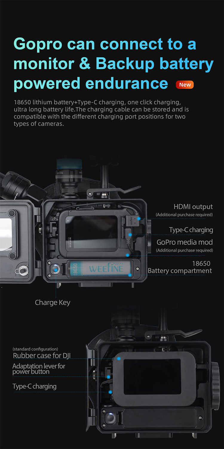 The casing of the Weefine action camera has undergone a two-stage anodizing process. Under water, it weighs only 69 grams and has a waterproof depth of up to 330 inches. It is suitable for extreme underwater environments. Its optical glass window ensures clear image capture. And it is compatible with the DJL action 4/5 and the GoPro Hero12/13 versions.