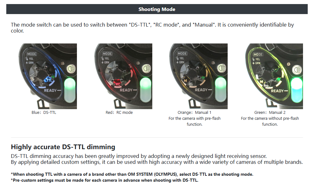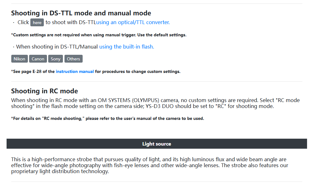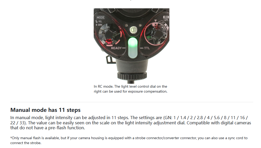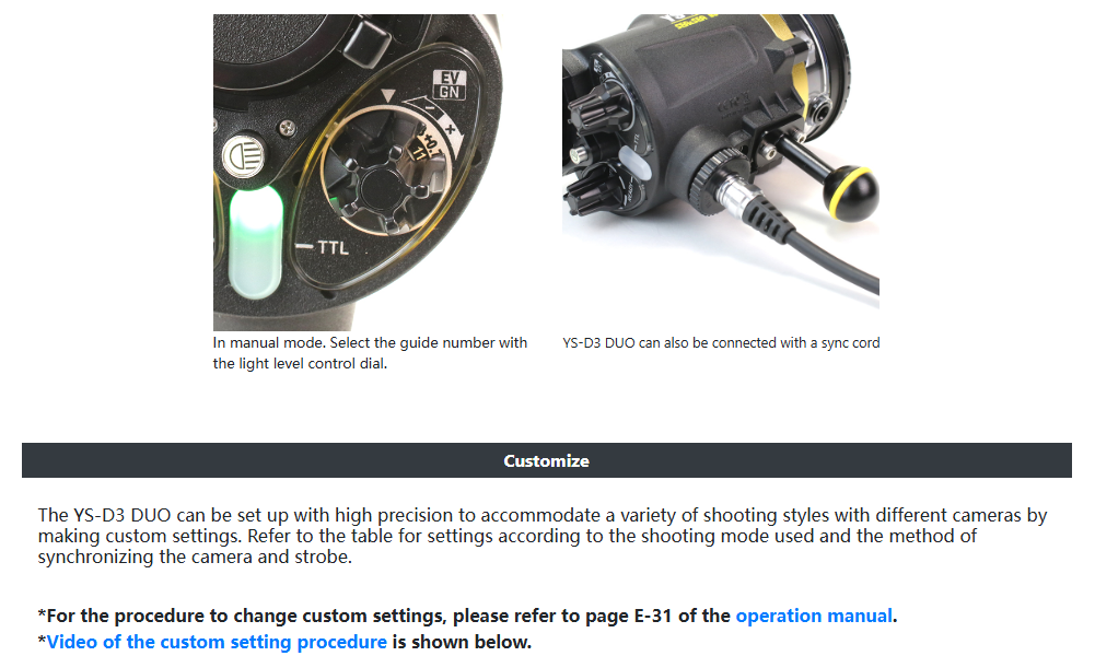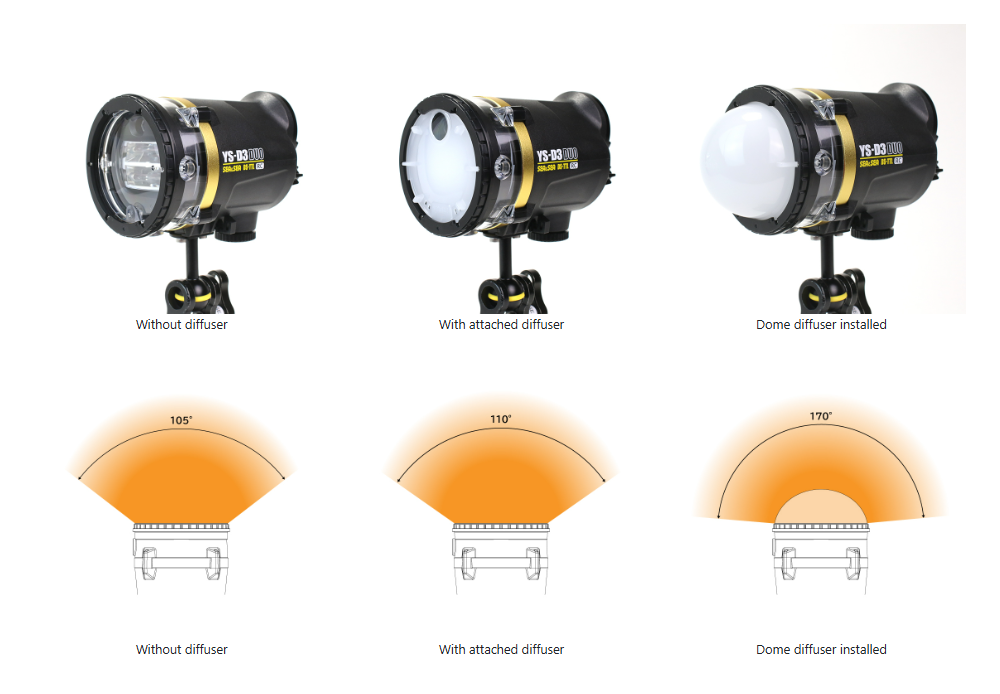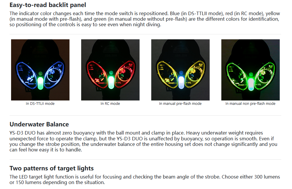 The YS-D3 DUO is a high-specification underwater strobe with three shooting modes: DS-TTL, RC mode, and manual.